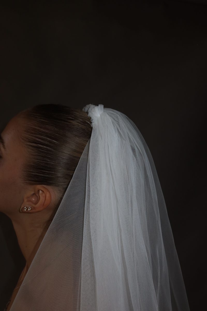 הינומה קצרה מסוג בד טול עם מסרק בחלק העליון וגימור מסגרת.